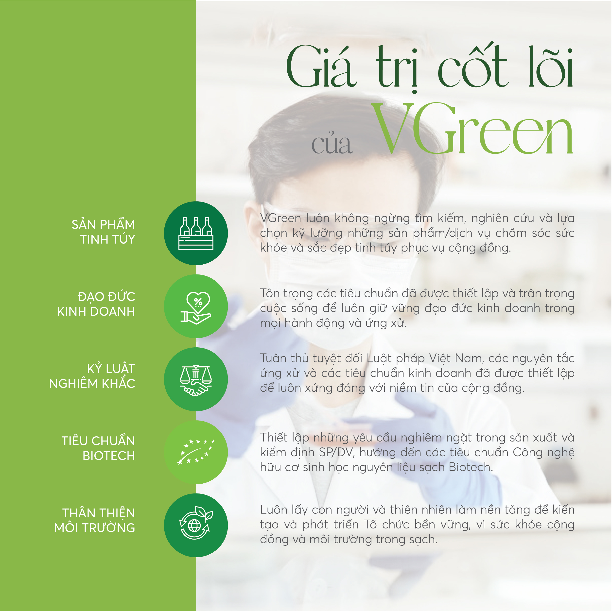 “VGreen tiếp tục hoàn thiện sứ mệnh mà DN đã tự tạo nên từ buổi đầu khởi nghiệp mang “thức uống xanh cho cuộc sống an lành, thuận theo tự nhiên”. Đó là VGreen sản xuất ra các sản phẩm đồ uống thay thế các loại đồ uống hoá chất độc hại trong gia đình bằng các sản phẩm thức uống an toàn có nguồn gốc thiên nhiên tốt cho sức khoẻ. Đặc biệt, VGreen ưu tiên chế biến và sản xuất các thức uống từ nông sản, đặc sản địa phương nhằm tôn vinh nông sản Việt Nam, giúp các sản phẩm chế biến từ nông sản địa phương có thị phần cao ngay tại thị trường nội địa cũng như sẵn sàng cho việc quảng bá ra thị trường quốc tế”